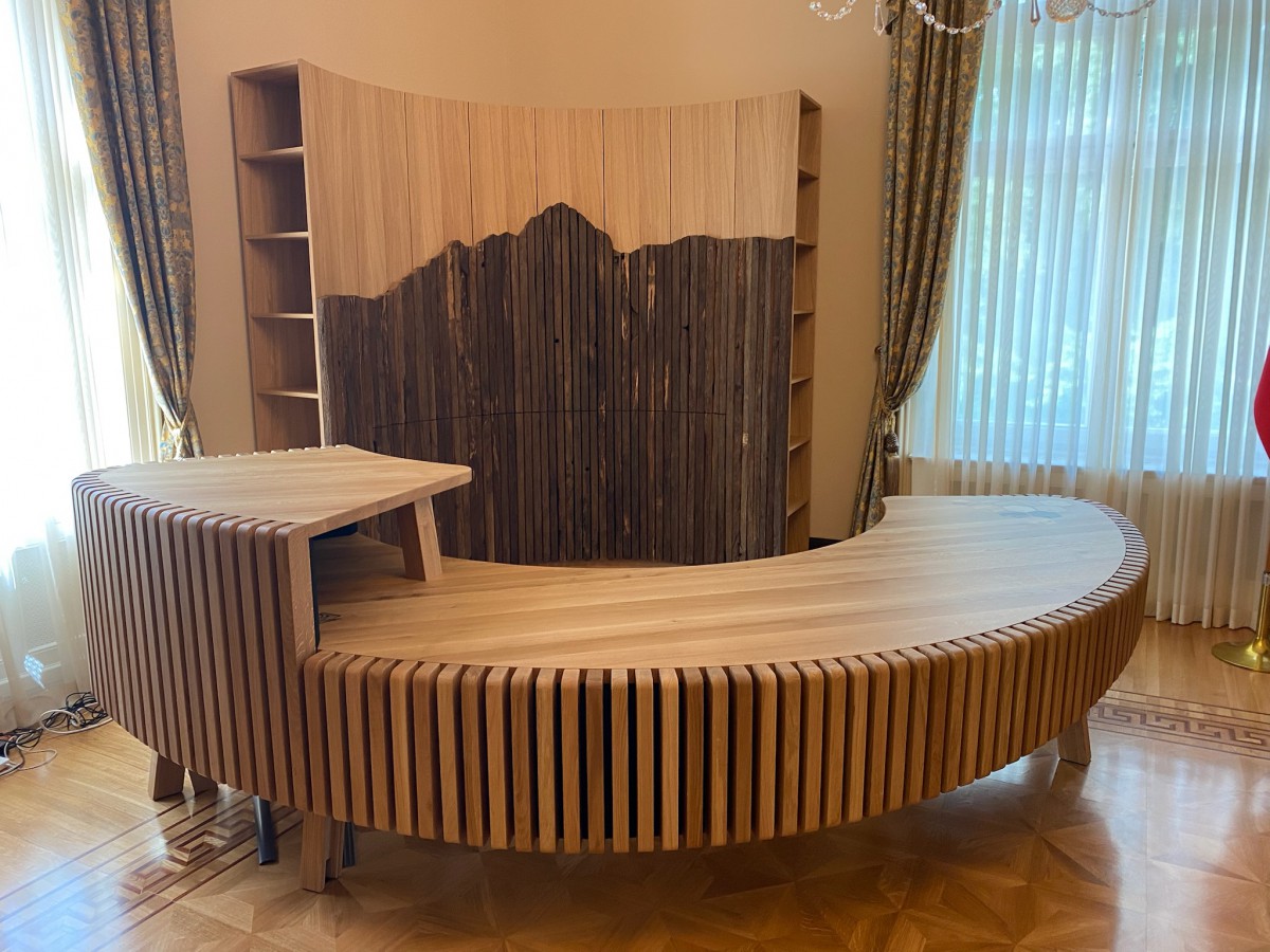 Medtem se je v podjetju OSM v Škofji Loki rodila ideja o pisarni kot idealnem prostoru, ki združuje tradicijo in zgodovino, sodobno delovno okolje in prostor, kjer se gradijo in razvijajo nove ideje, poznanstva ter tlakujejo poti, ki vodijo v napredek. »V začetku leta 2024 nas je dr. Musar povabil k izdelavi nove pisarne za predsednico države. Projekt je že imel zelo premišljeno in zanimivo idejno zasnovo, ki so jo pripravili v inštitutu Innorenew, ter je ponujal veliko kreativnih možnosti. S sodelovanjem arhitektke Eve Prelovšek, dr. Musarja in našega podjetja smo ga v dobrem letu razvili do Pisarne Viševnik, prežete s slovensko tradicijo in simboliko,« razloži lastnik podjetja OSM Rok Koprivnikar.