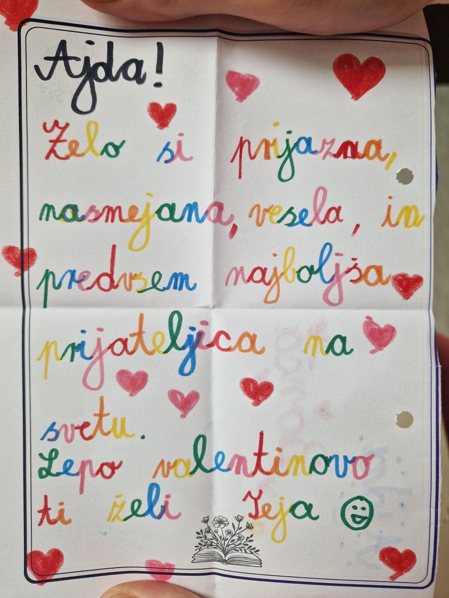 Pred valentinovim so otroci pisali sporočilca, katerih namen ni bil praznovanje ljubezni v romantičnem smislu, ampak spodbujanje prijaznosti, pozornosti in toplih medosebnih odnosov. Učenci so pisali pisma sošolcem, prijateljem, učiteljem ali komur koli, za katerega so menili, da bi mu lahko polepšala dan. Prvošolci so se že v šoli pripravili na pustovanje. Naučili so se nove pustne pesmi in z veliko domišljije in zagnanosti izdelovali svoje pustne maske, ki so jih nesli domov in se predali počitniškemu pustnemu razpoloženju.