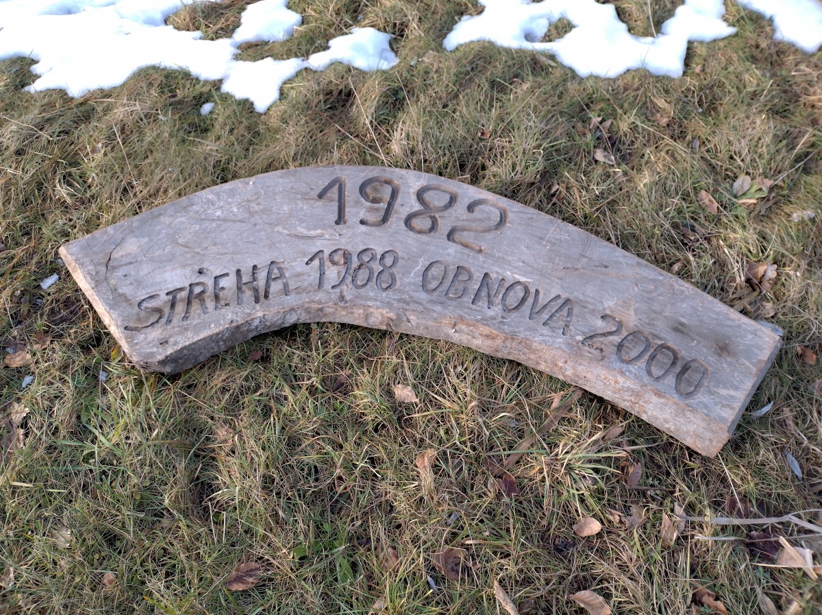 Ploščo so občinski komunalni delavci spravili pod streho, da se je osušila, s tem pa se je preprečil njen propad. Izdelana naj bi bila iz topolovega lesa, na njej pa so tri letnice. Izgradnjo mostu označuje letnica 1982. Kakor se spominja Metod Potočnik s kmetije pri Šupcu na Hotavljah, so ga z veliko prostovoljnega dela na novo postavili v začetku osemdesetih let. Les zanj so prispevale tri kmetije, ki so imele zemljišča tudi na drugi strani Sore: Šupcova, Maticova in Presercova. Organizacijo gradnje je koordiniral Karel Jezeršek s kmetije Matic, ki je poskrbel tudi za omenjeno ploščo.