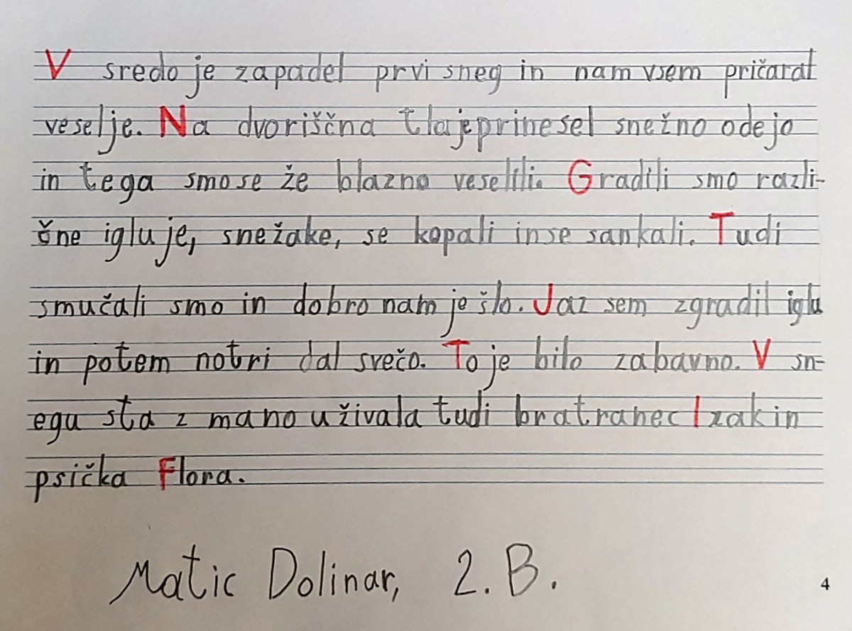 Drugošolci so zapis velike začetnice vadili ob pisanju zimskih zgodbic, šestošolci so pri slovenščini brali odlomek iz romana Ognjeni kelih (J. K. Rowling) in si ob tem zamislili, kakšen bi bil videti Harry Potter kot snežak. Z novim letom se je zaključil razpis za "dopisno" Malo Groharjevo kolonijo. Na njem so se predstavile štiri učenke naše šole – Zala Peternel, Tina Dolinar, Sara Robba in Lejla Vita Rihtaršič.