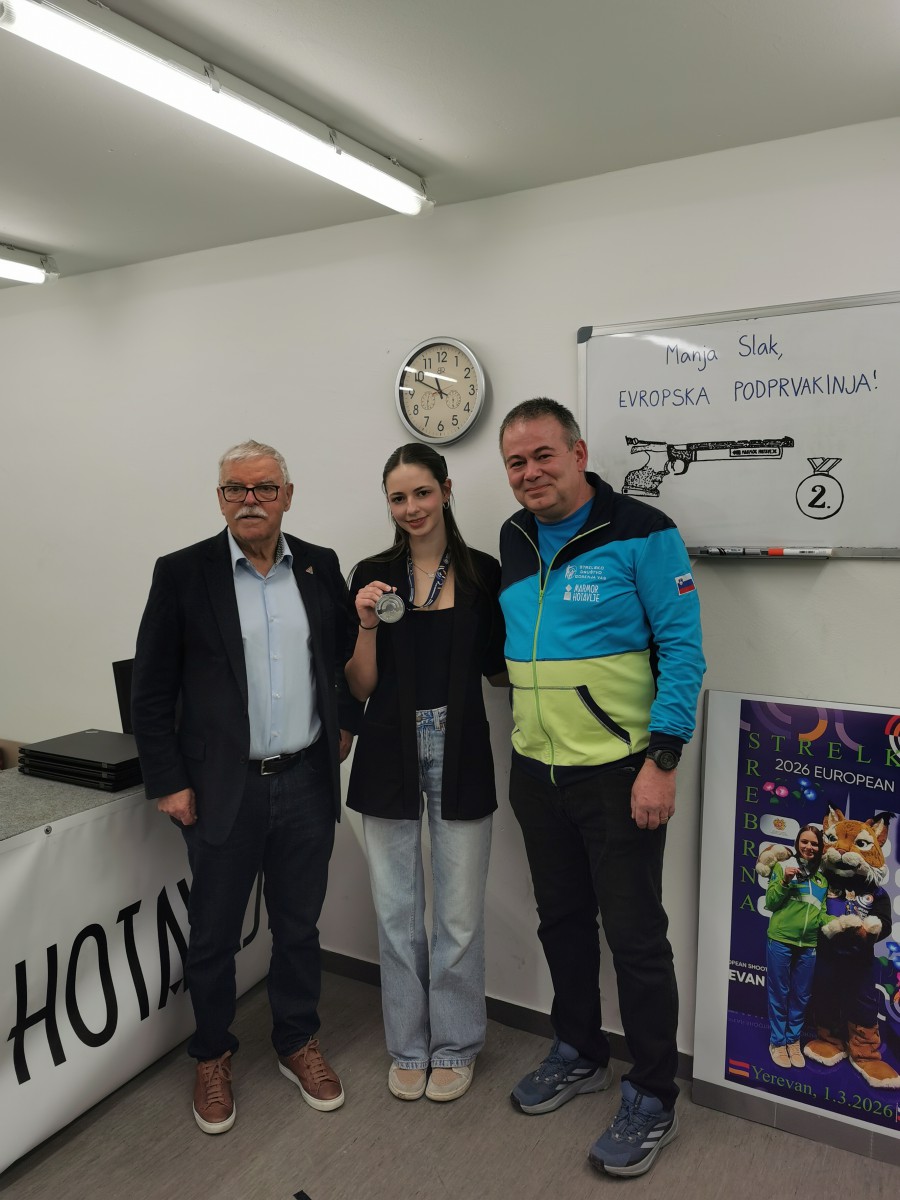 V začetku marca je SD Gorenja vas pripravilo slavnostni sprejem v čast Manji Slak, ki je na nedavnem evropskem tekmovanju v Erevanu v Armeniji osvojila stebrno medaljo in s tem dosegla najboljšo uvrstitev slovenske reprezentance. Na strelišču v Gorenji vasi so se zbrali člani domačega društva, strelci iz sosednjih društev, prijatelji in zvesti podporniki. »Veseli in ponosni smo na Manjo, saj glede na mladost dosega odlične rezultate,« so povedali. Manja Slak je v kvalifikacijskem delu zadela 573 krogov, kar je bil sedmi dosežek v konkurenci 59 tekmovalk. V finalu osmih najboljših strelk iz kvalifikacijskega dela je zadela 238,2 kroga, pred njo je bila le Madžarka Veronika Major z 238,8 kroga.
