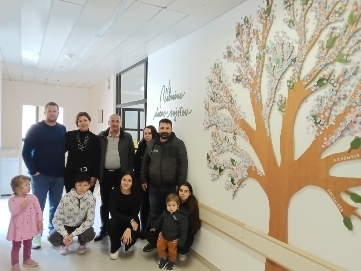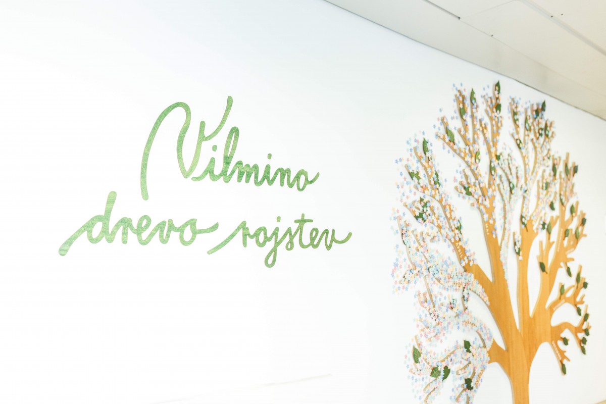 V spomin na lani preminulo priljubljeno babico Vilmo Meglič s Trebije so eno od sten v porodnem bloku Univerzitetnega kliničnega centra Ljubljana okrasili s prav posebnim drevesom – Vilminim drevesom rojstev.